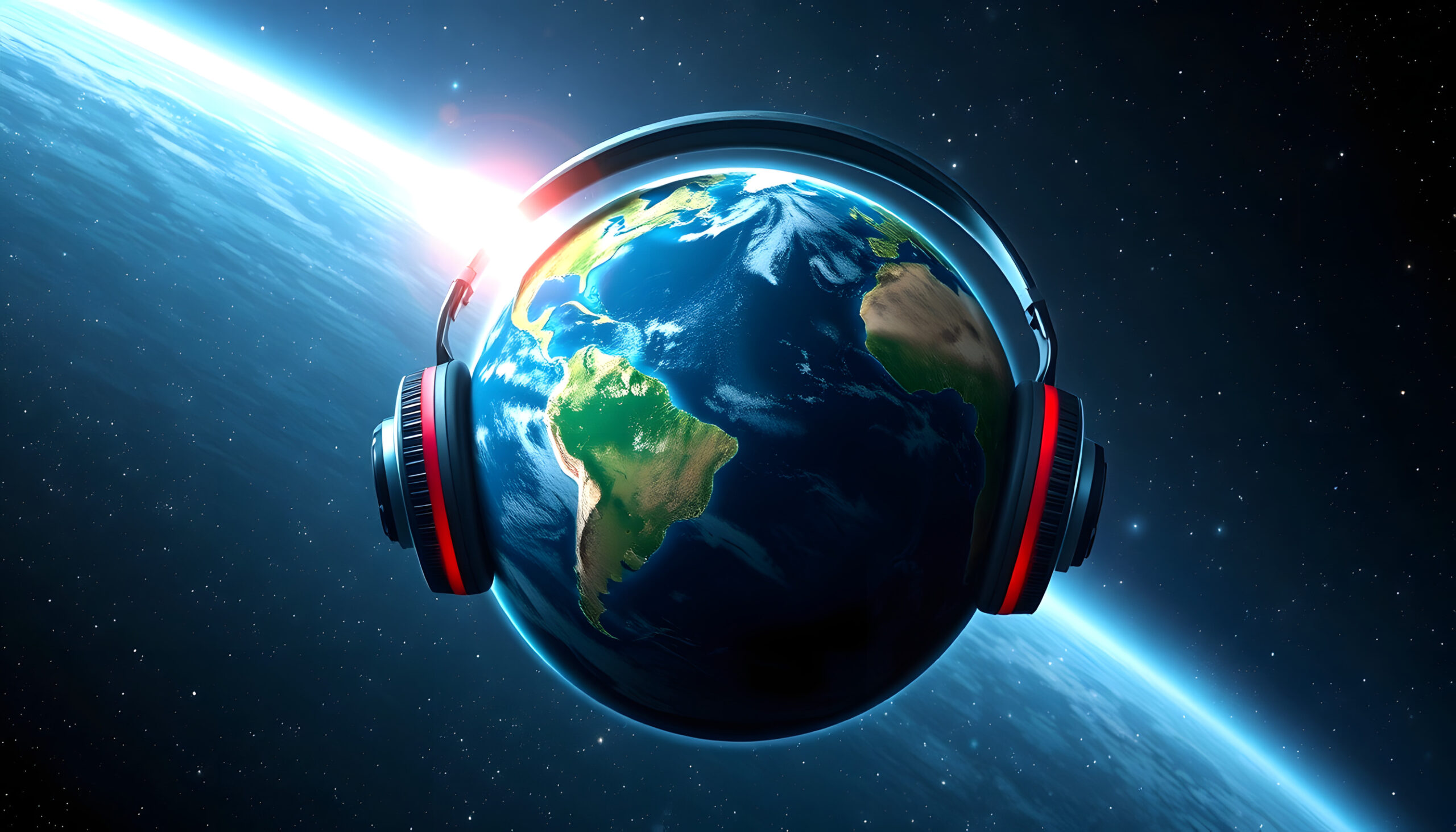 Planet earth with headphones in a cosmic setting illustrating global music connection. stunning space artwork vision for concepts. AI, Backlit, with white tones