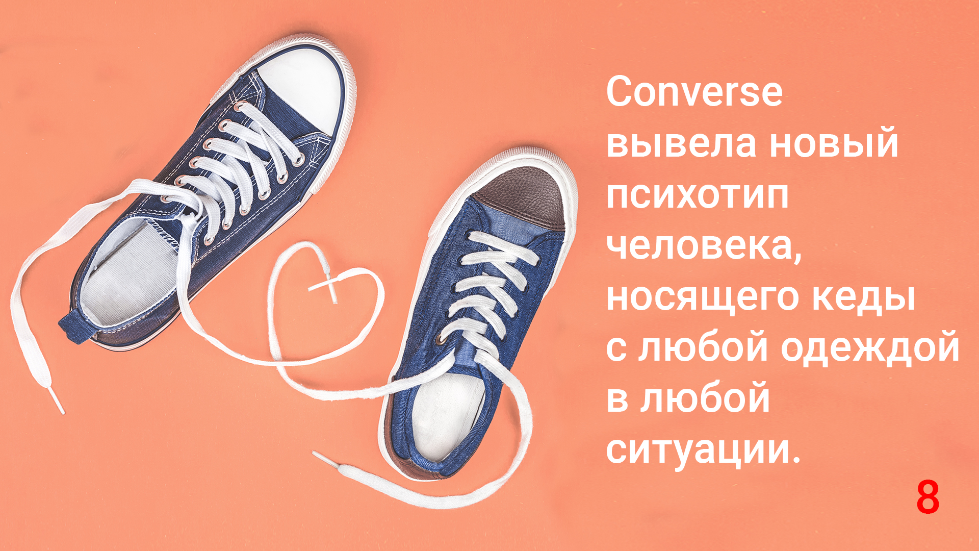 Мы рассказали вам историю компании, создавшую больше, чем спортивный обувной тренд, – психотип человека, носящего кеды, энергичного, вечно молодого, ценящего удобство, комфорт и свой индивидуальный стиль во всем. А вы выбирайте сами, что вам и вашему Валентину или Валентине ближе – кеды с платьем, сникерсы с джинсами и пиджаком и т.д. Ведь после романтического ужина вы можете захотеть пробежаться в парке под дождем или поиграть в футбол, что тоже вполне романтично. В конверсах вам все можно и все под силу. Счастья вам и любви!