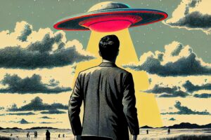 Back view of man looking at alien invasion, UFO flying in the sky, concept of evidence and sighting, retro illustration. Generative AI
